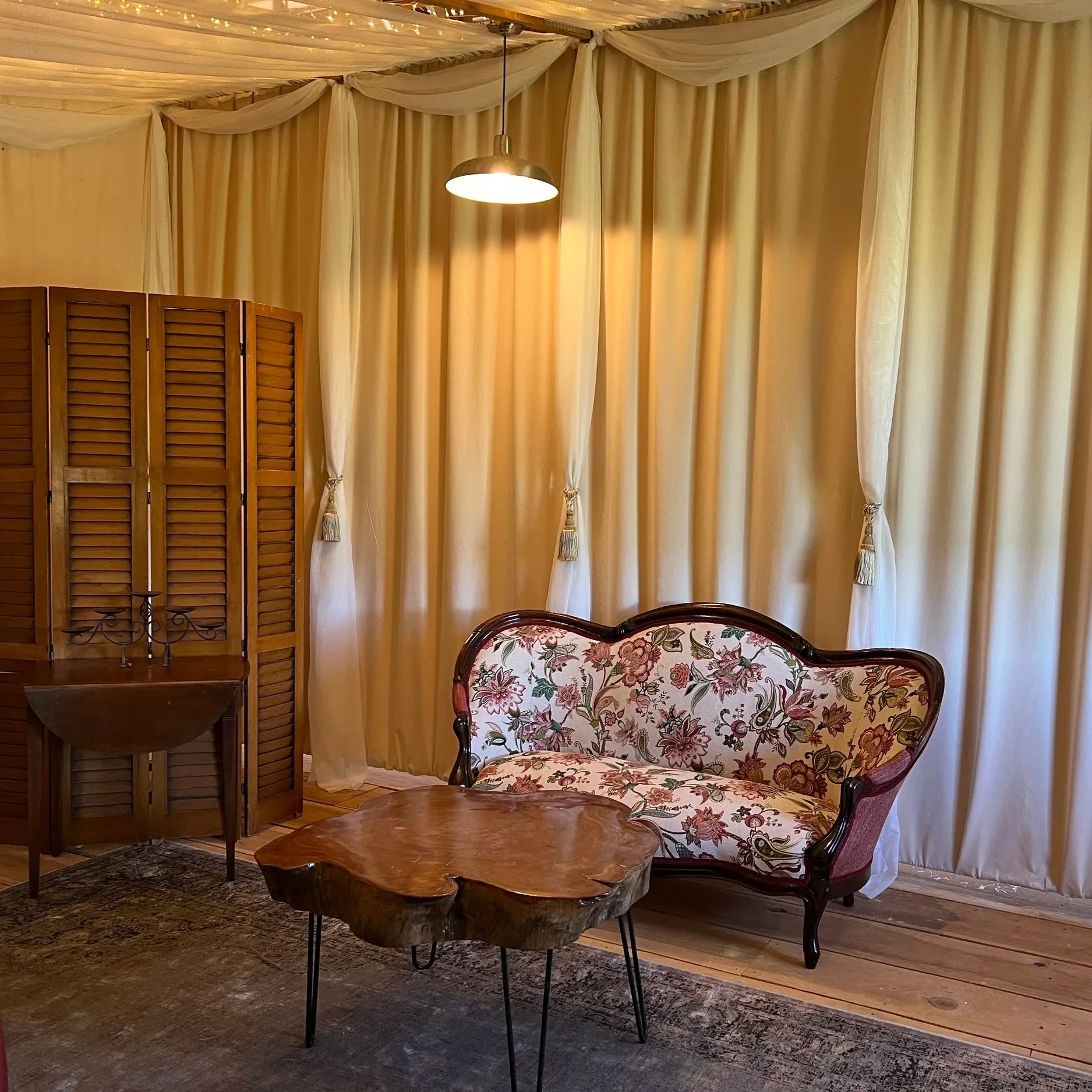 Nestled beside the pond and its sparkling fountain, just steps from the firepit, the gazebo offers a cozy and romantic gathering place. Fully furnished and centered around a glowing fire table, it invites guests to linger under the stars, surrounded by the soft glow of string lights. Optional mosquito netting ensures comfort while preserving the charm of this intimate space. Whether it’s for toasts, quiet conversations, or laughter that carries late into the evening, the gazebo naturally draws people together, wrapping your celebration in warmth and ease. →
